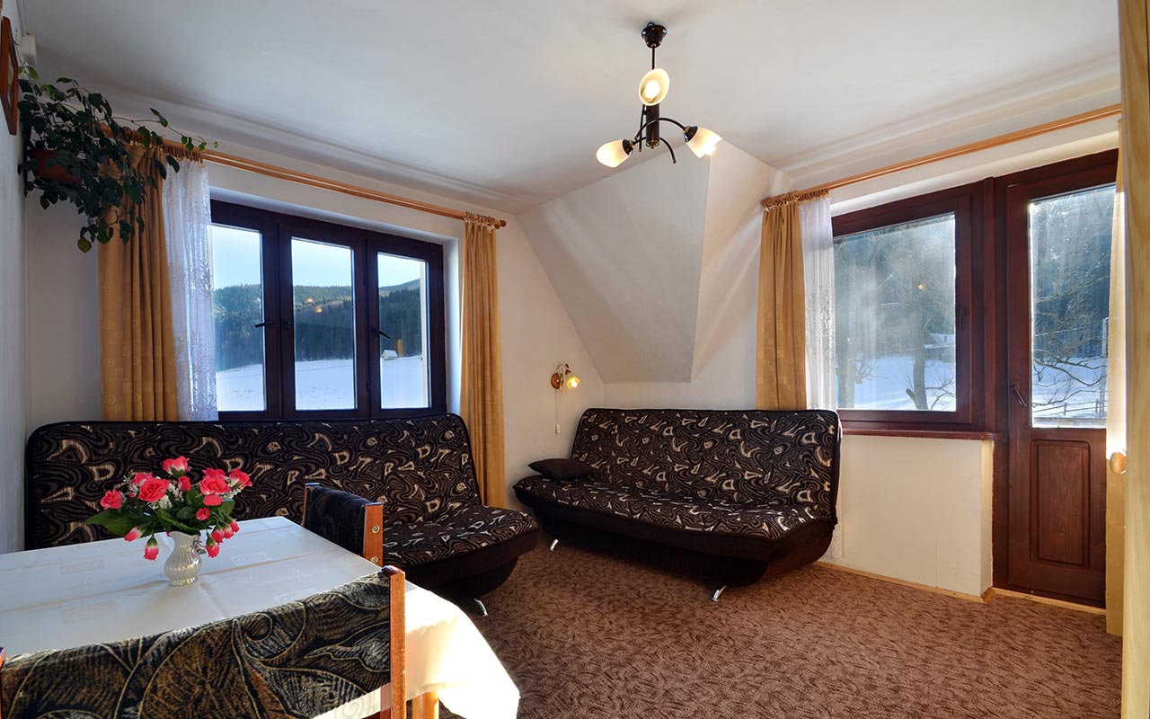 alloggio per 2 + 2 persone, con bagno privato e balcone con una magnifica vista sulle montagne, che renderanno sicuramente più piacevole il vostro soggiorno. In camera troverete due comodi divani letto matrimoniali pieghevoli, un set